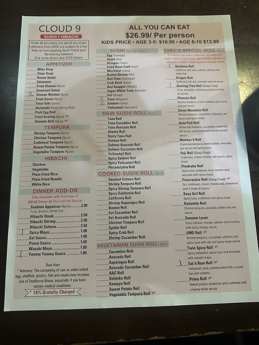 Rainbow roll, spider roll, spicy California roll.