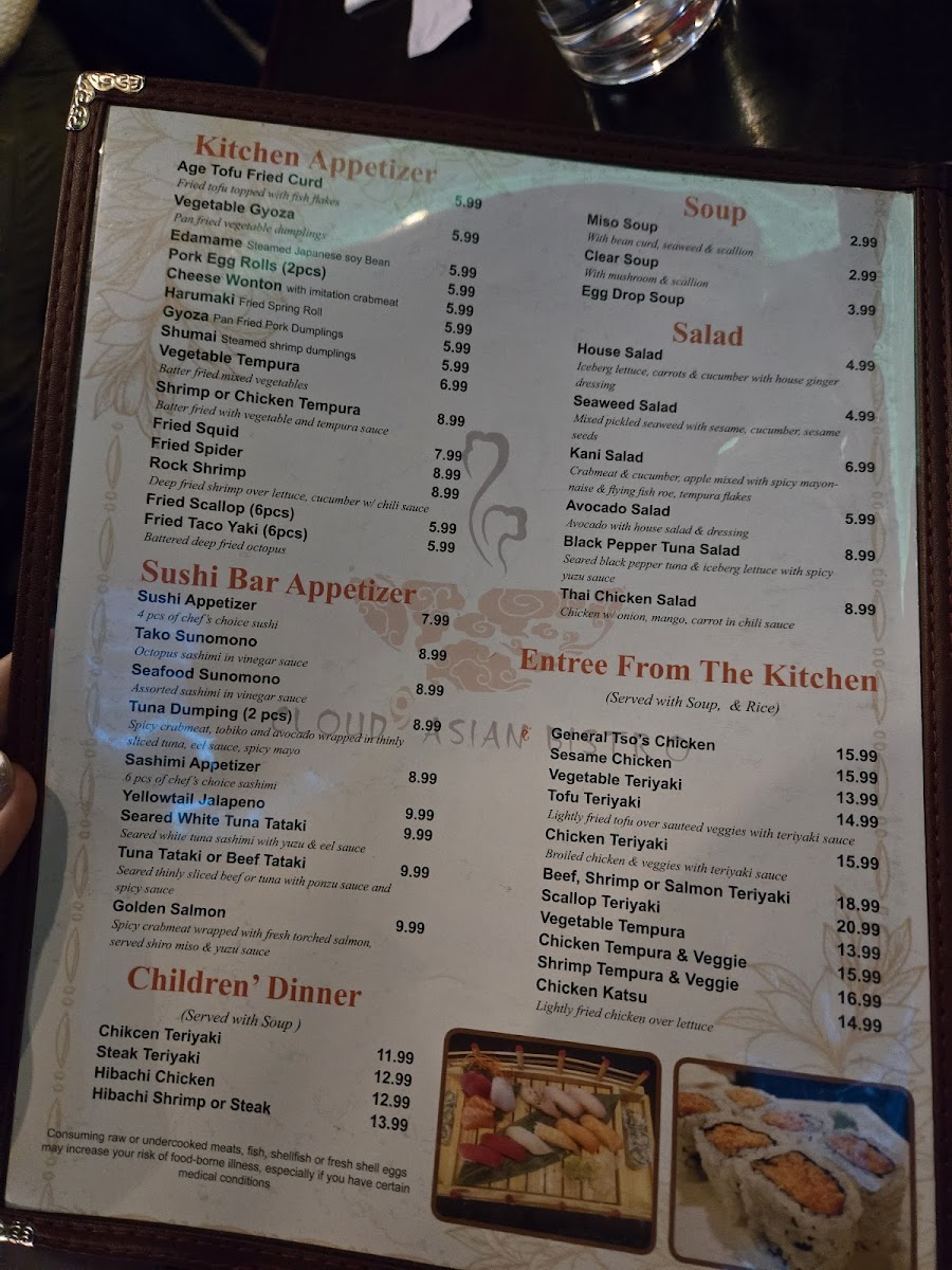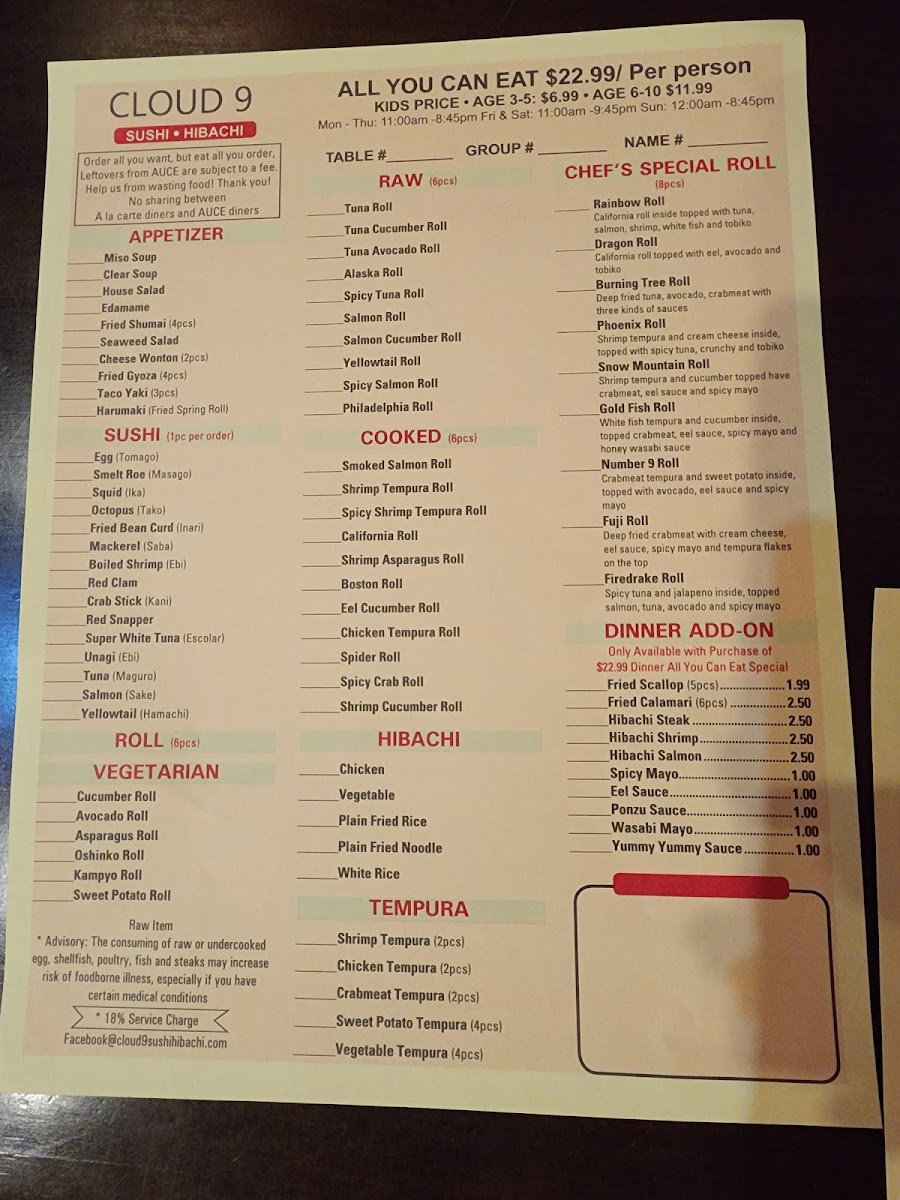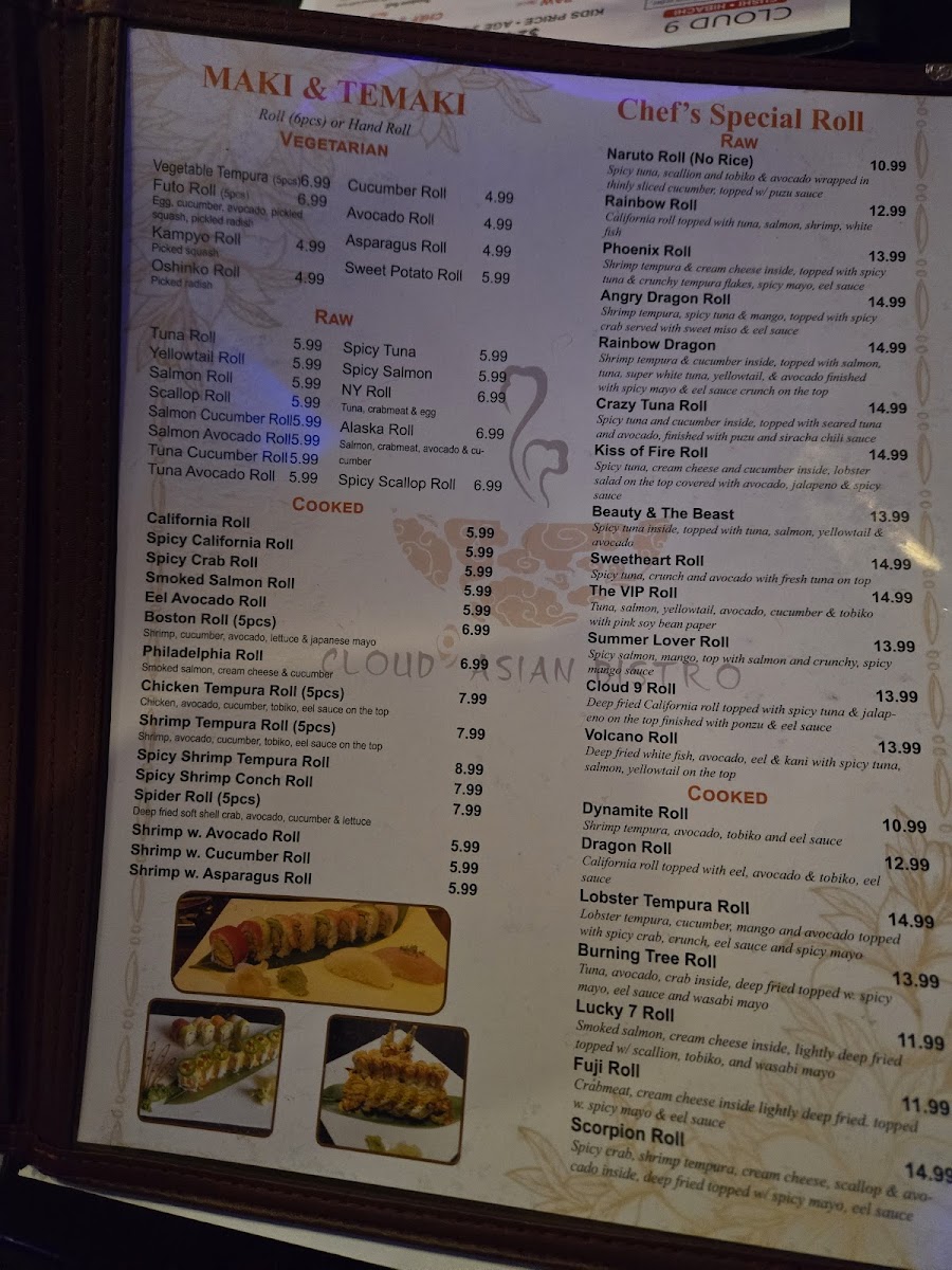 Fuji roll, shrimp tempura roll, California roll.